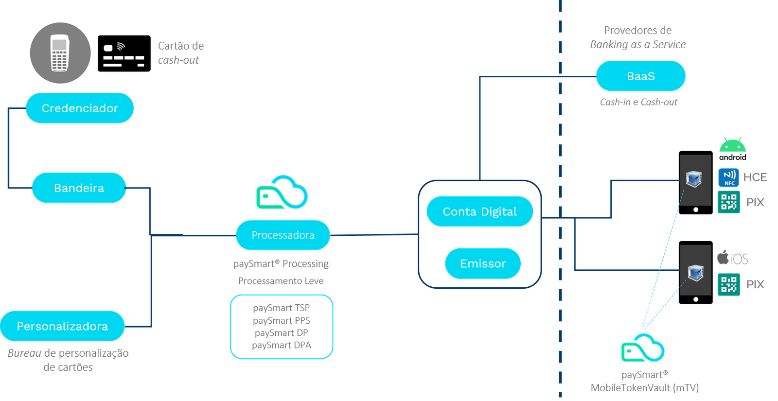 A plataforma de pagamento leve é uma solução da paySmart, agora Evertec, para emissores de cartões. O emissor se conecta a tecnologia da empresa e a fintech cuida de todo o resto.